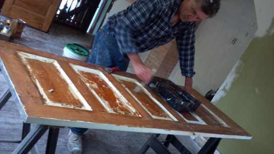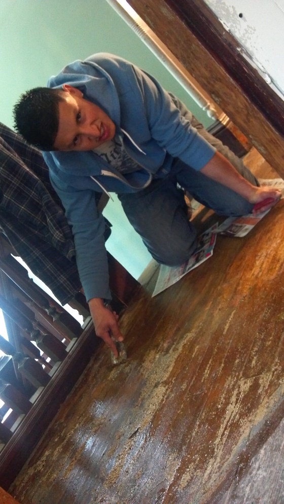When I finally got my hands on the wallpaper we set right in to work. Since part of the paper would be bordered by the exposed brick chimney we had to clean the bricks before applying the paper. In removing the plaster and scrubbing away the dust, the mortar had become a bit stained. My dad suggested applying an acid made specifically for cleaning stone to get the brick and mortar back to sparkling.