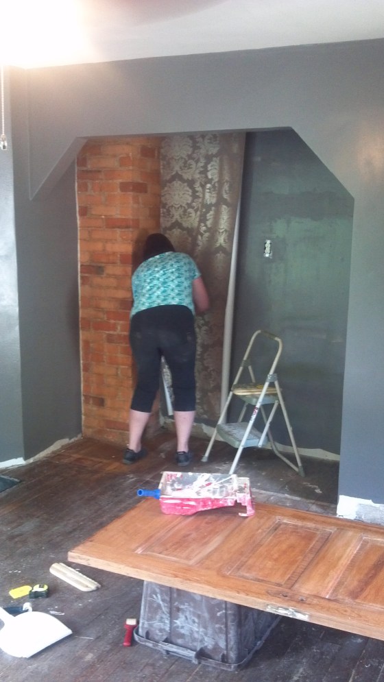 The actual hanging of the wallpaper is the trickiest part. Managing 8ft of soggy paper is not the easiest task in the world. Luckily, I had someone who lived through all the wallpaper nightmares of the 60’s, 70’s and 80’s to help me out-my mom 😉