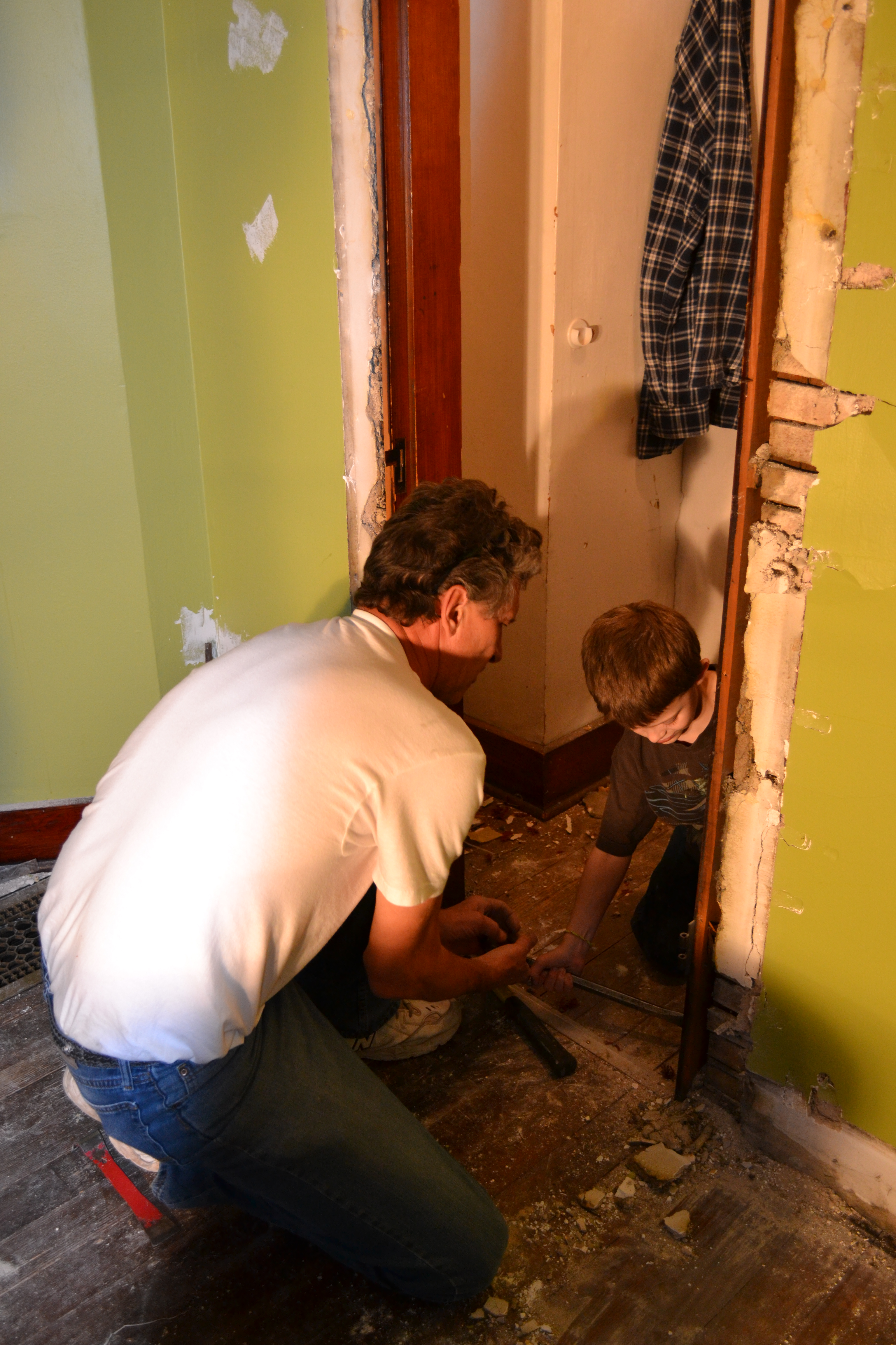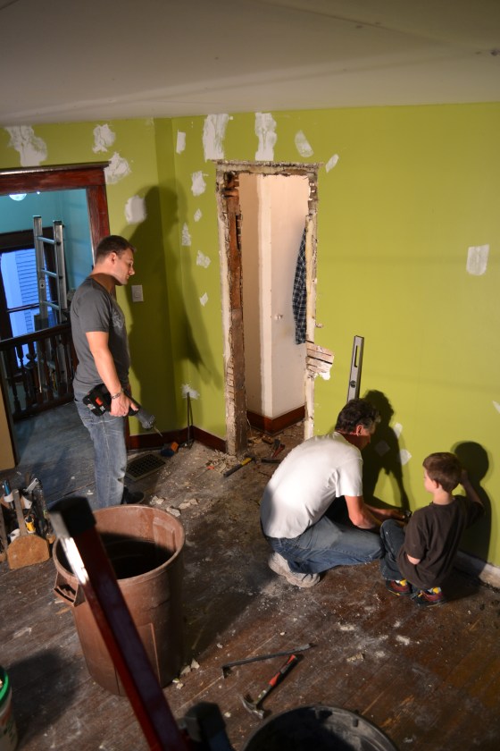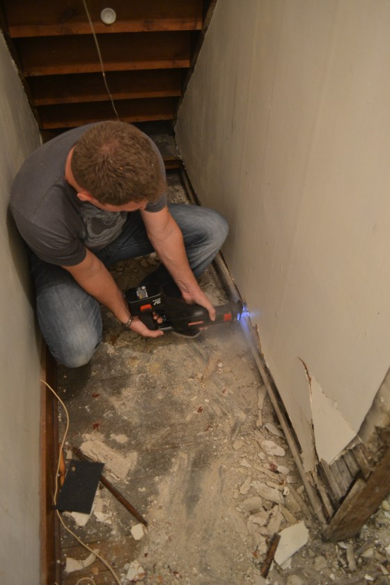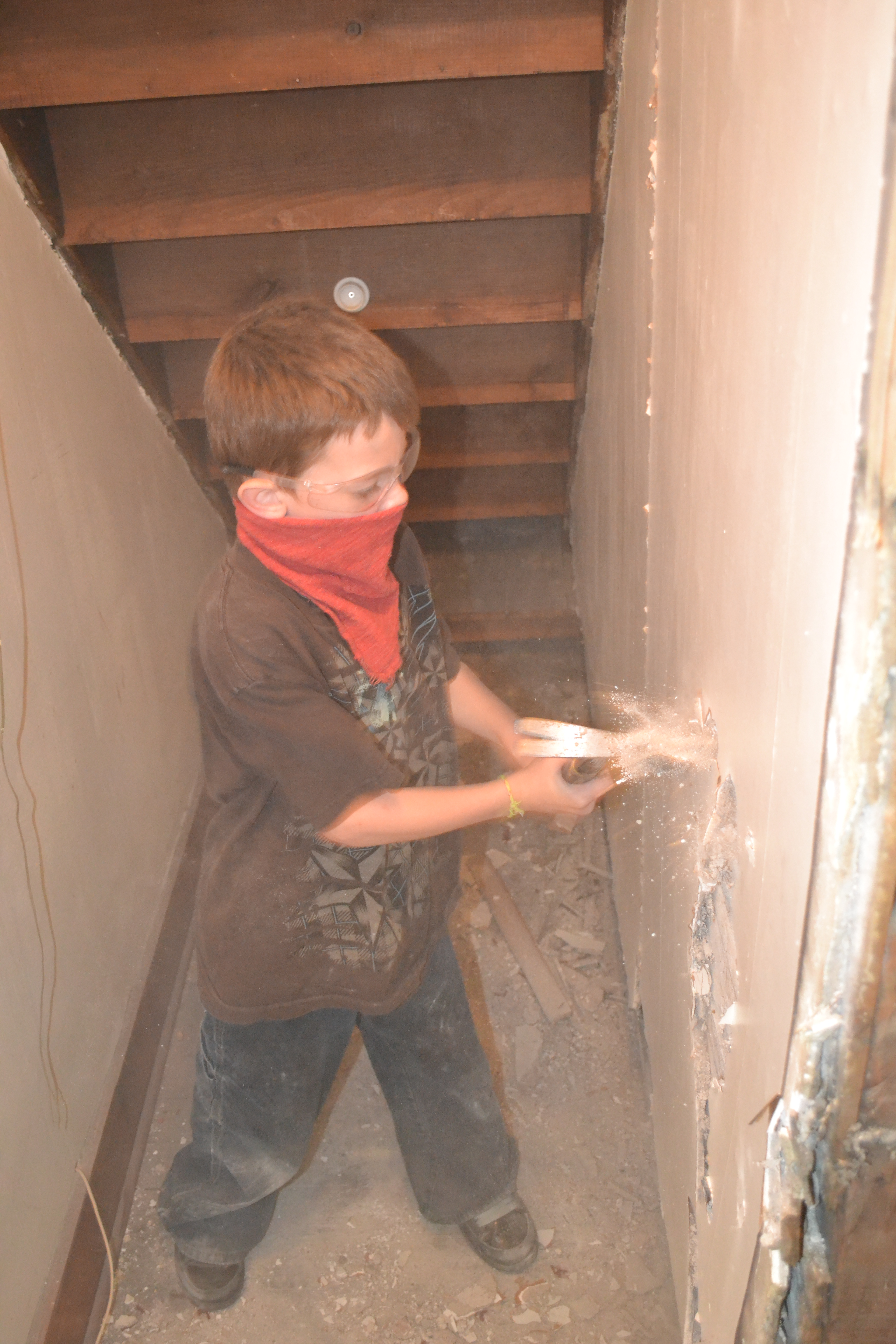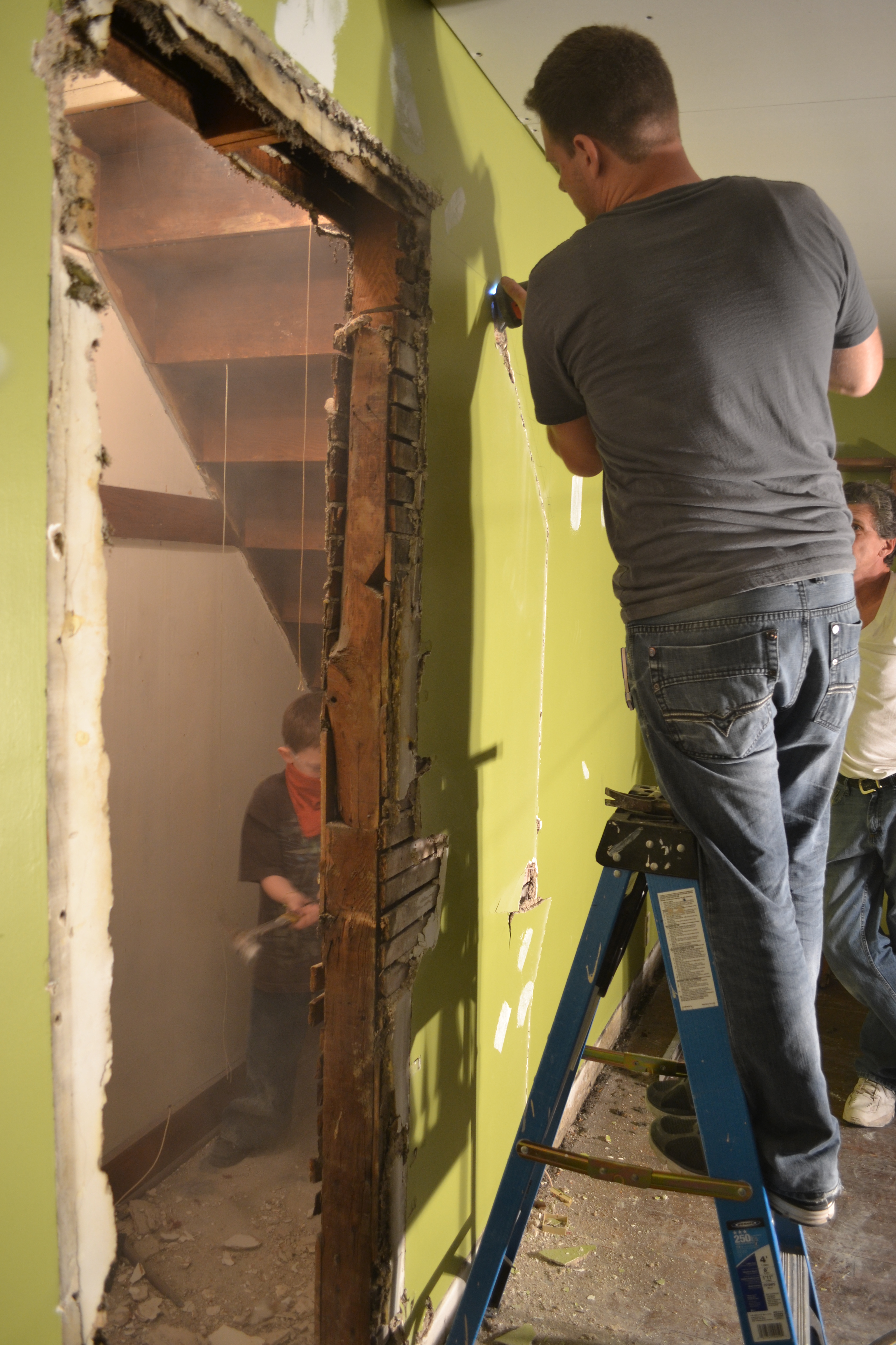 After we were finished, we headed upstairs to inspect the handiwork of the boys. They had finished the ceiling rather quickly. Let it be known here that a drywall lift makes hanging a ceiling muuucchh easier. Next came the part that Tyler had been begging for all day- breaking down the wall under the staircase and opening up a closet to make space for a built in dresser and TV nook. Check out the story in pictures.
