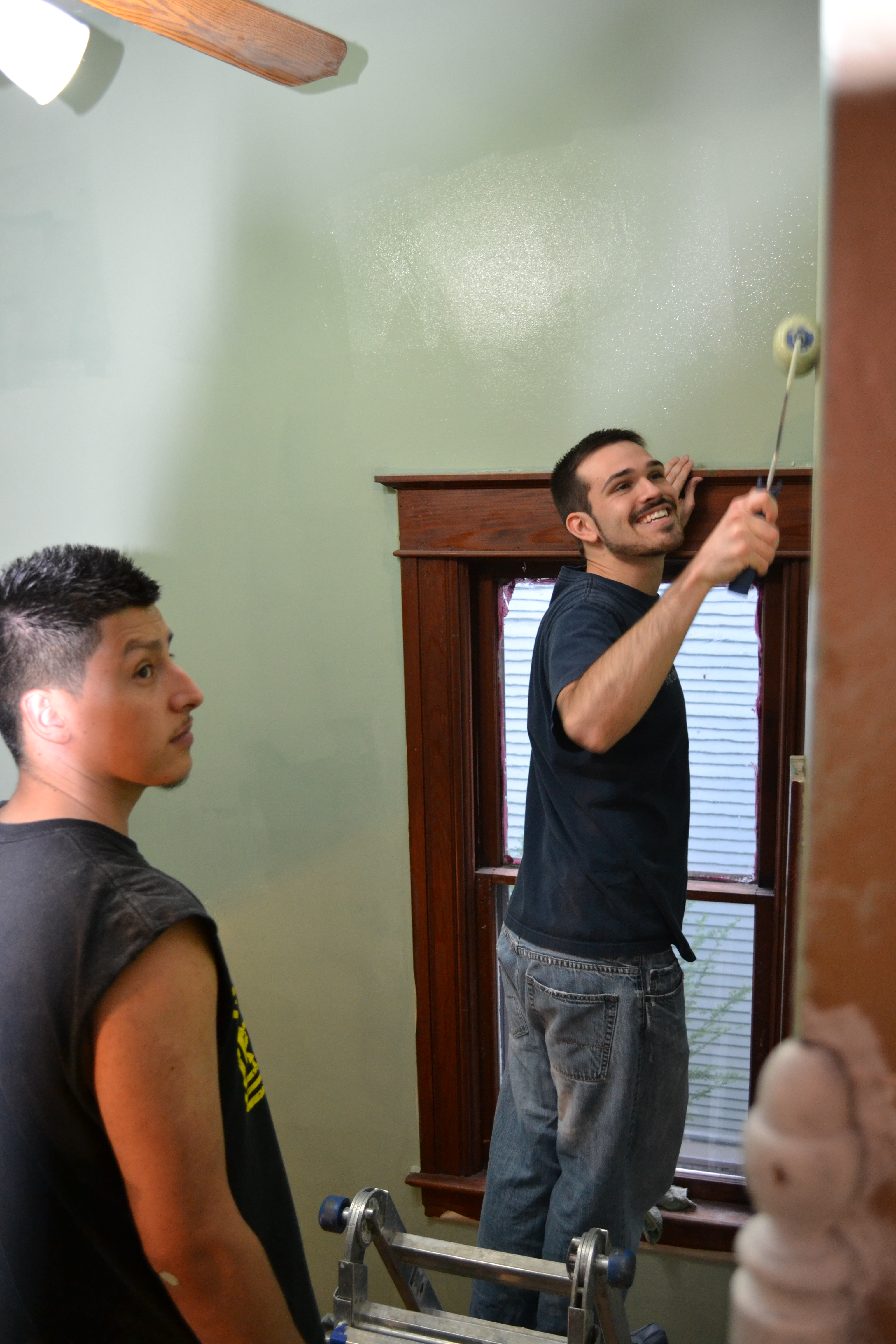 We ended up going with a neutral tan color for the living room which really helped bring out the awesome purple and green marble fire place. The entry way and staircase were done in a light jade green which went we with the dark woodwork and made a great combination with the living room and fireplace. With Jason and I rolling and my mom using a brush to cut in we had the job done in a couple of hours.