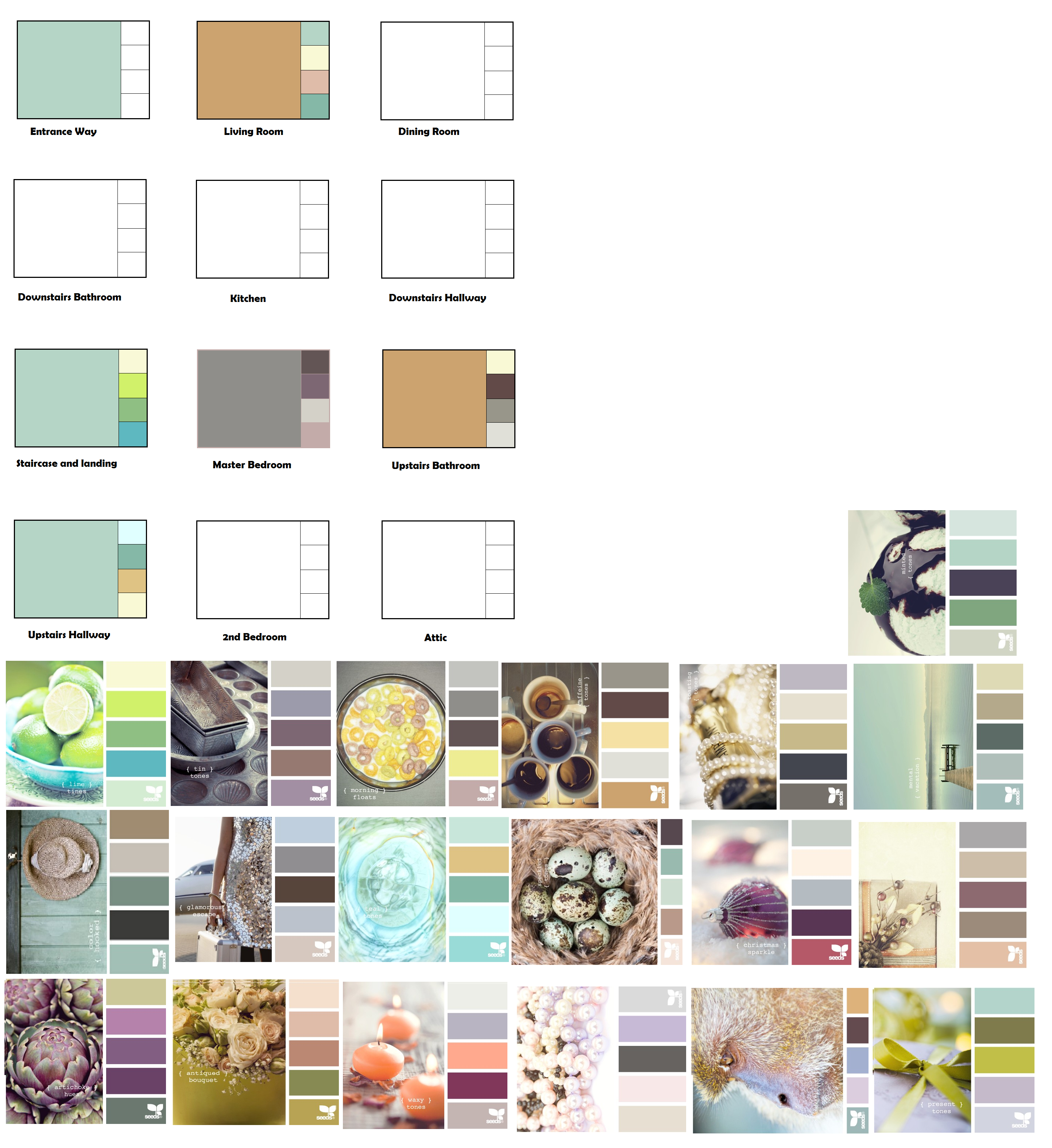 Introductions over (house meet friends, friends meet house), it was time to get to work. Phil, Tyler, Raul and my dad all headed up to the master bedroom with several sheets of drywall to begin hanging the new ceiling while my mom, Jason, and I began to paint the living room and entry way. I had been debating for months on what I would paint this house. Luckily, I found this great color pallette site on Pinterest and it helped me realize what kind of color vibe I was going for. Check out some of the color combinations that I played around with.