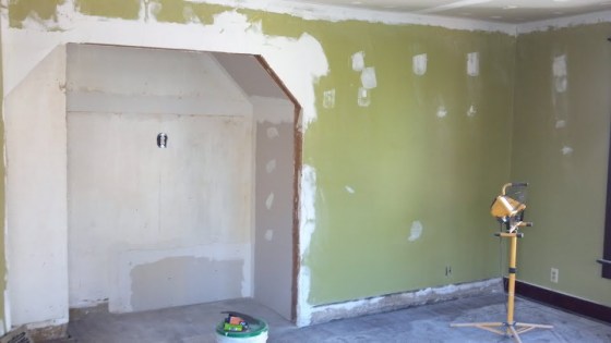 Taking down the wall really opened up the space. We closed off the staircase with a couple of pieces of drywall and also created an archway with some 2×4’s. The chimney on the left hand side was mudded and painted over so I have ordered some brick veneer stone blocks to create the “exposed” chimney that I want…you all can keep a secret, riiiigghhtt? 😉