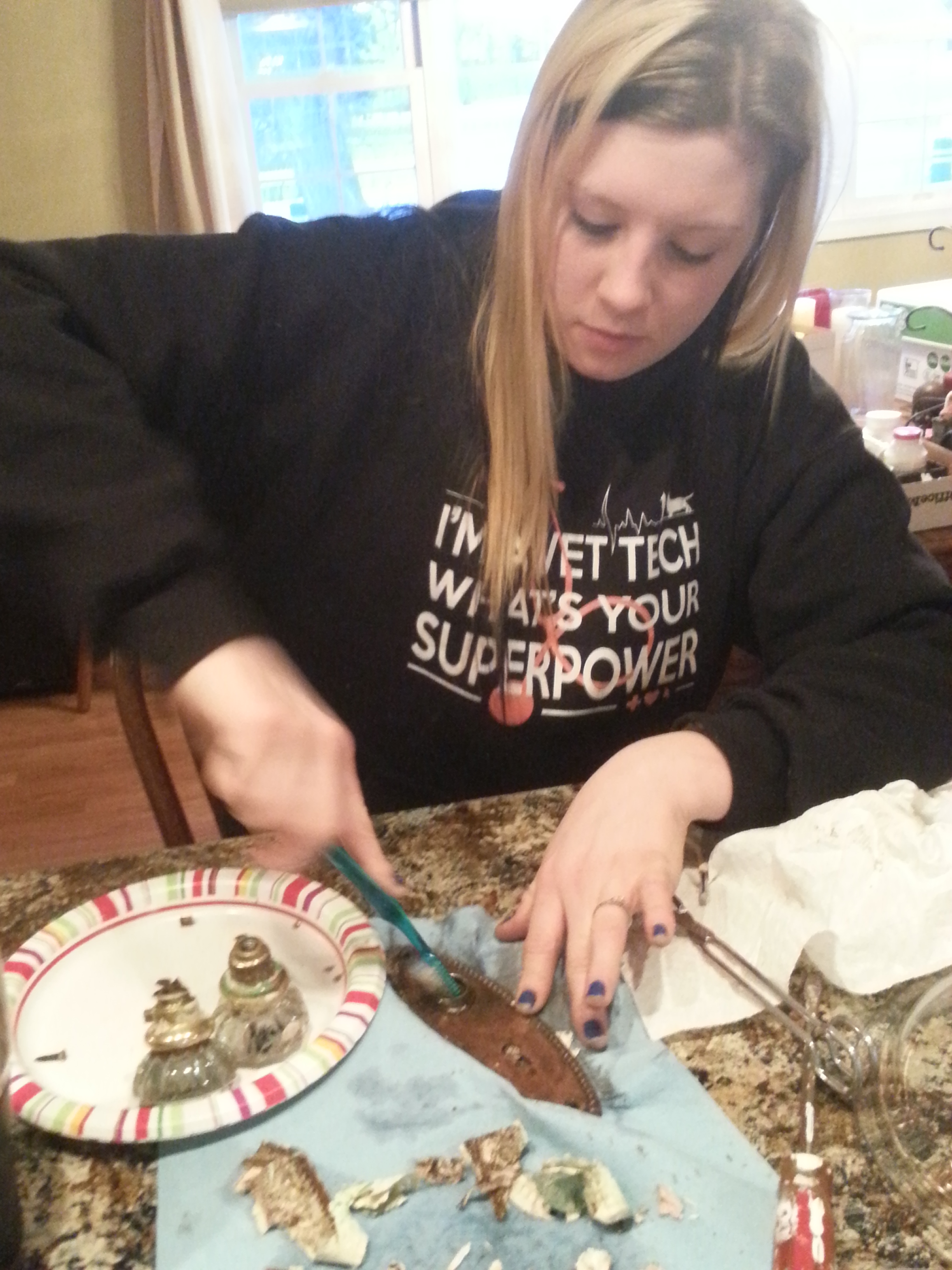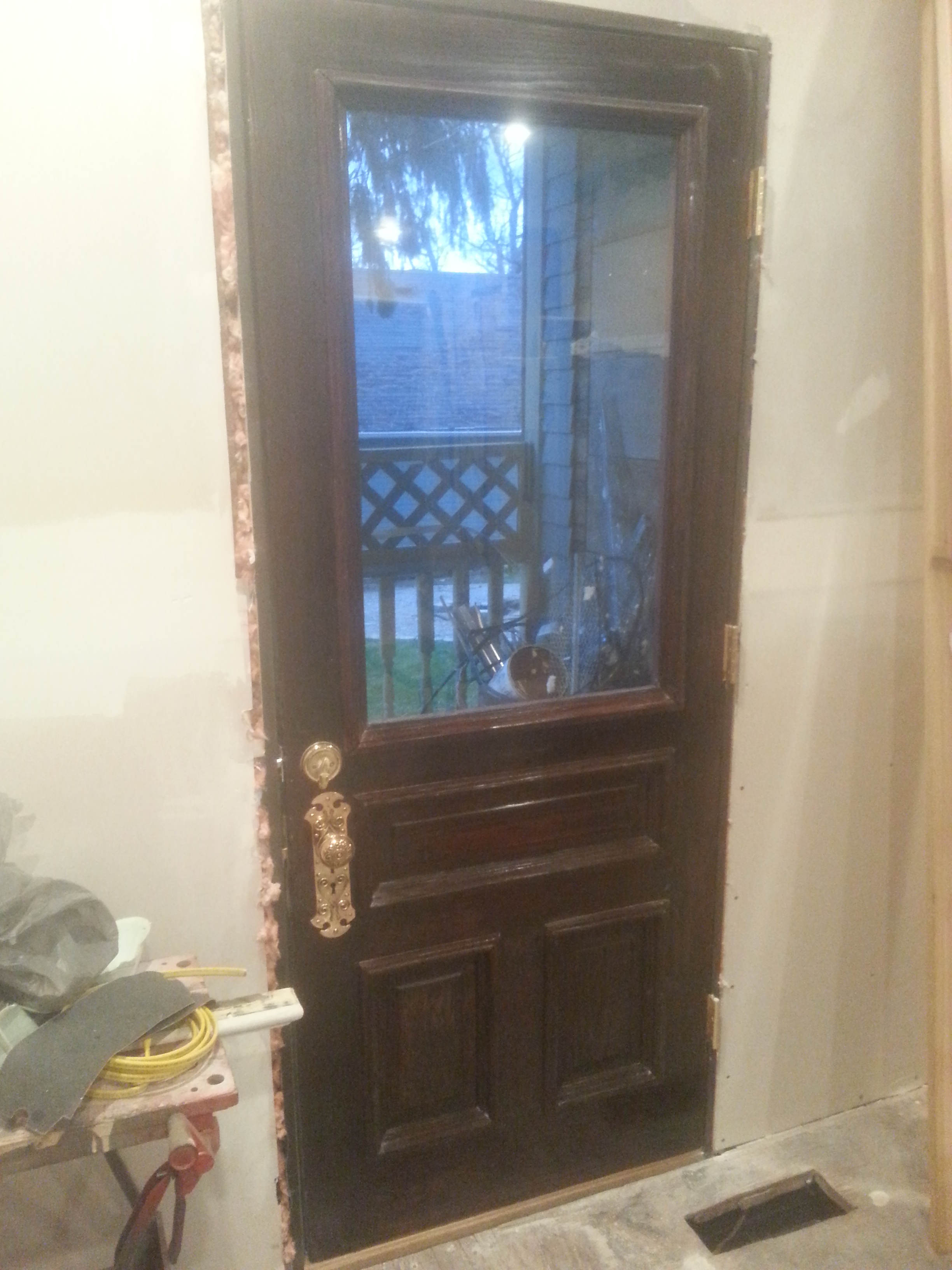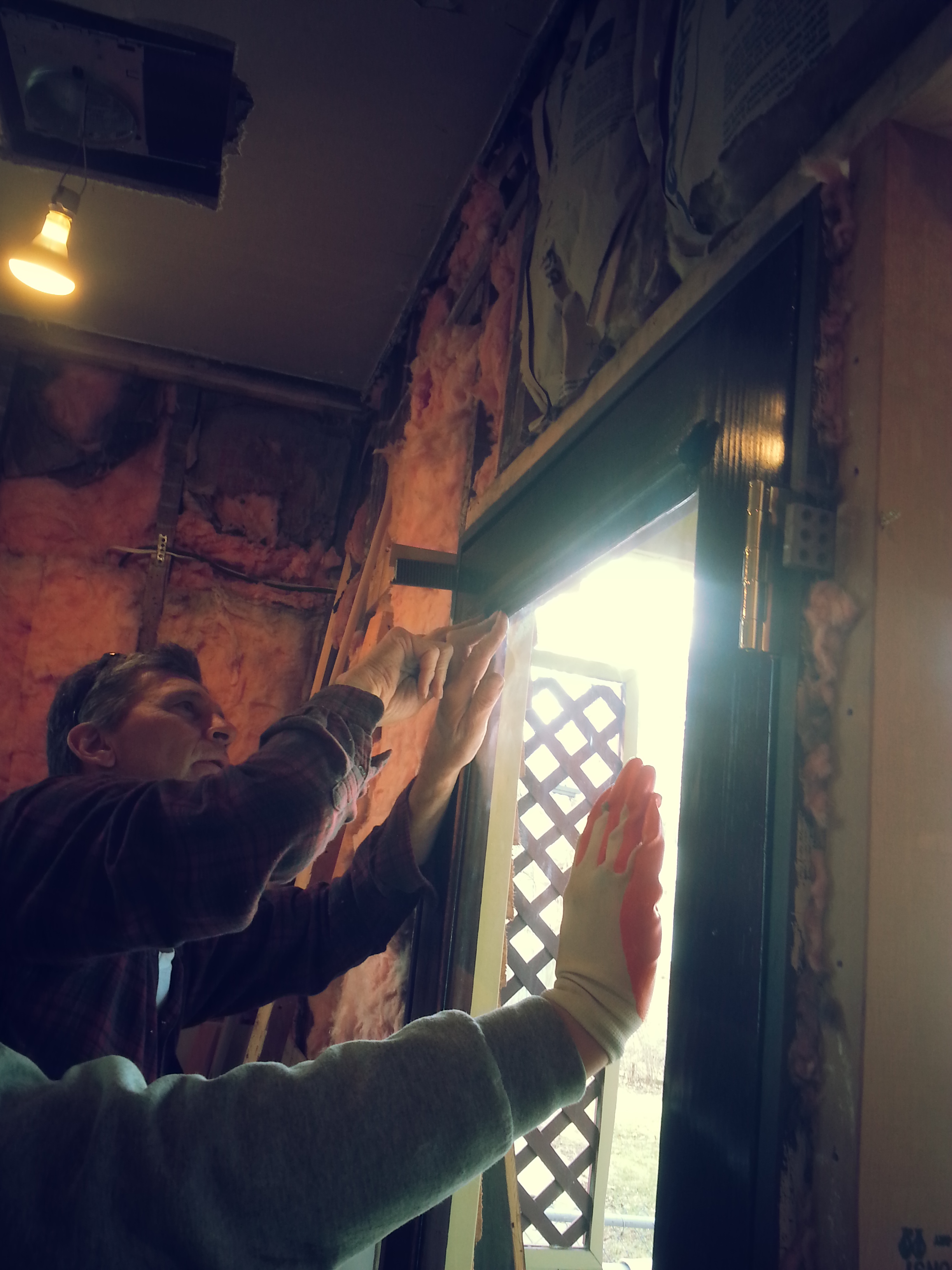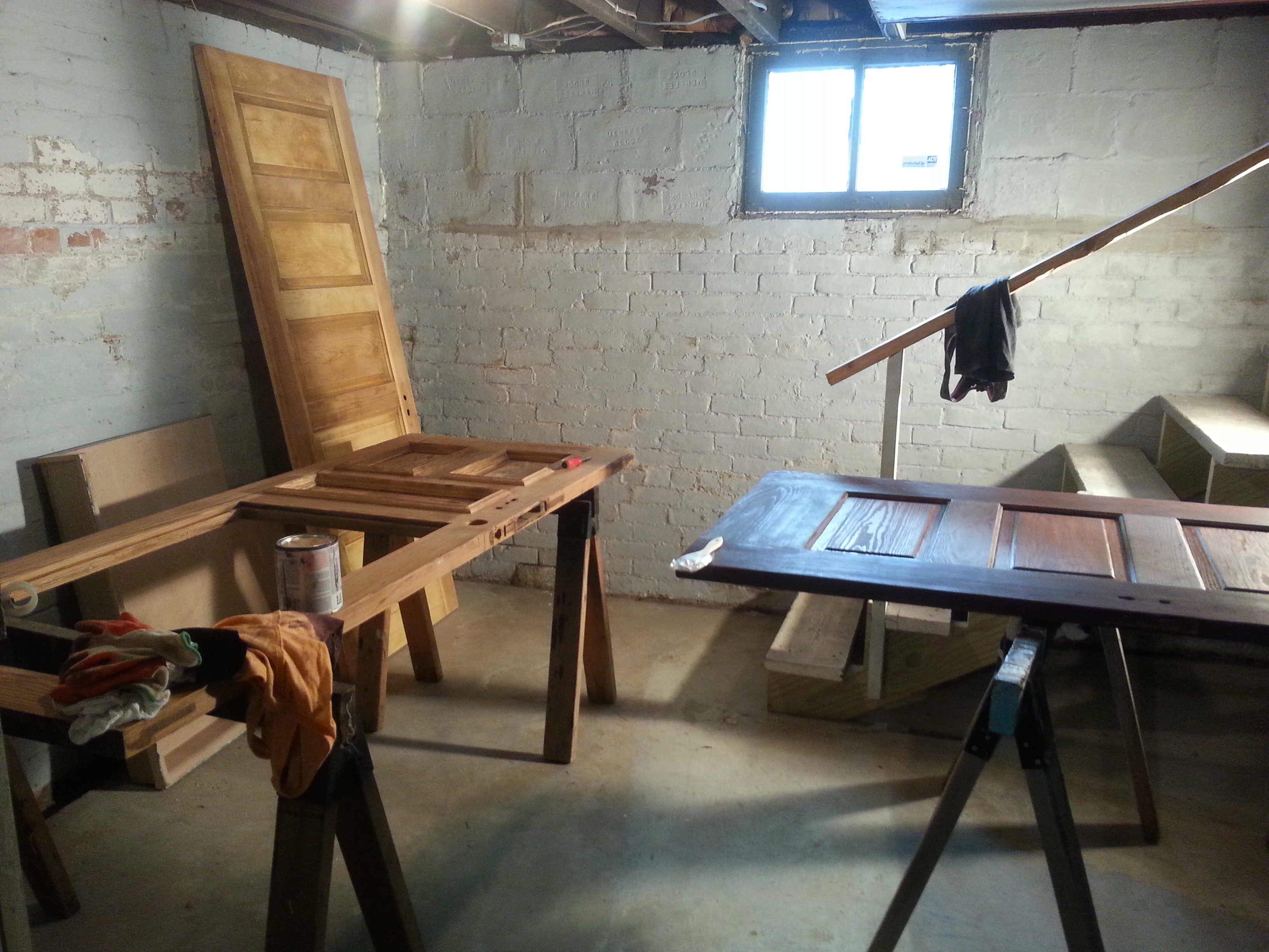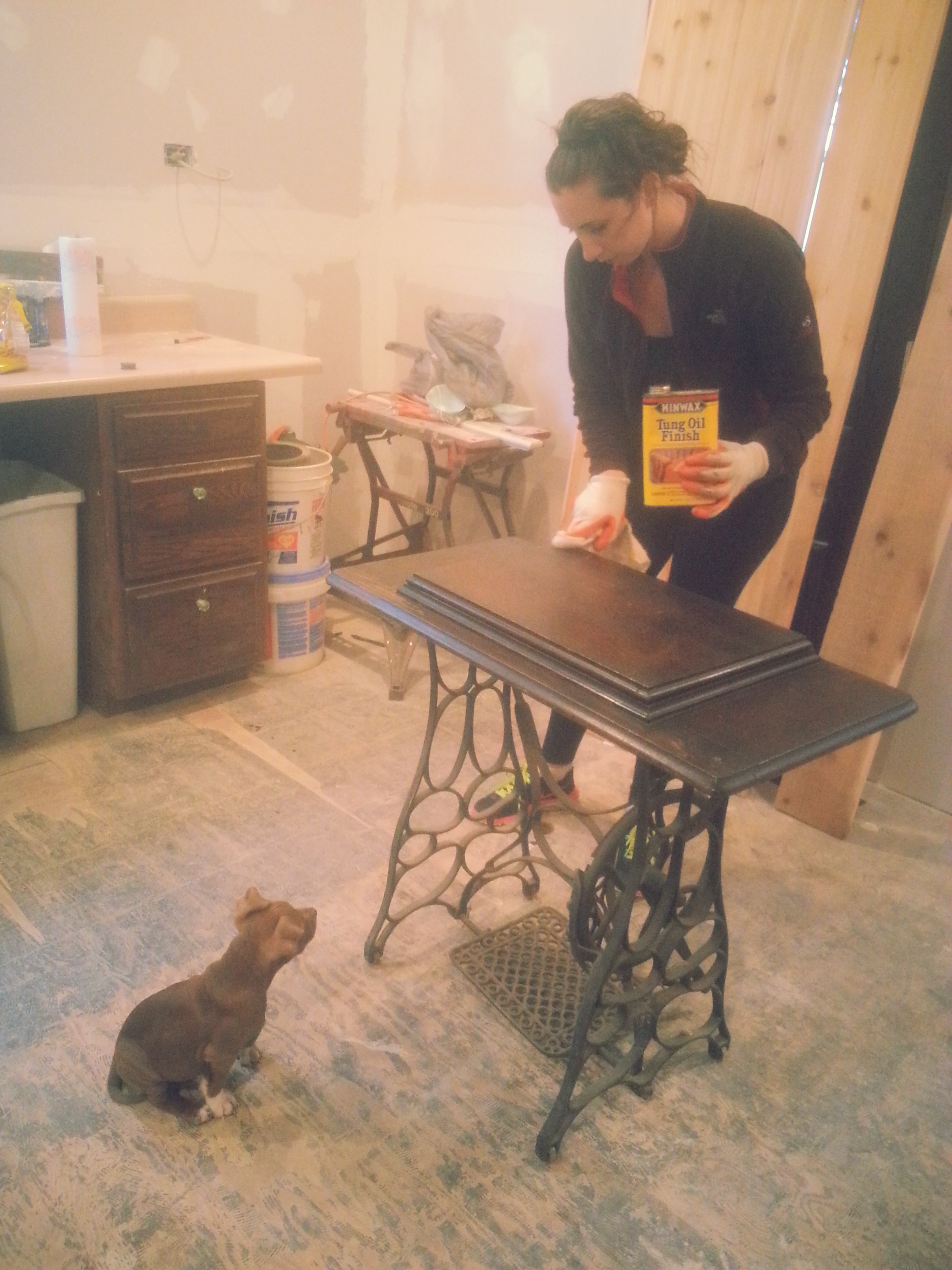While Raul and my dad worked on laying the tile, my mom and I got to work staining the floor transitions that would go between the kitchen and dining room and the kitchen and foyer.