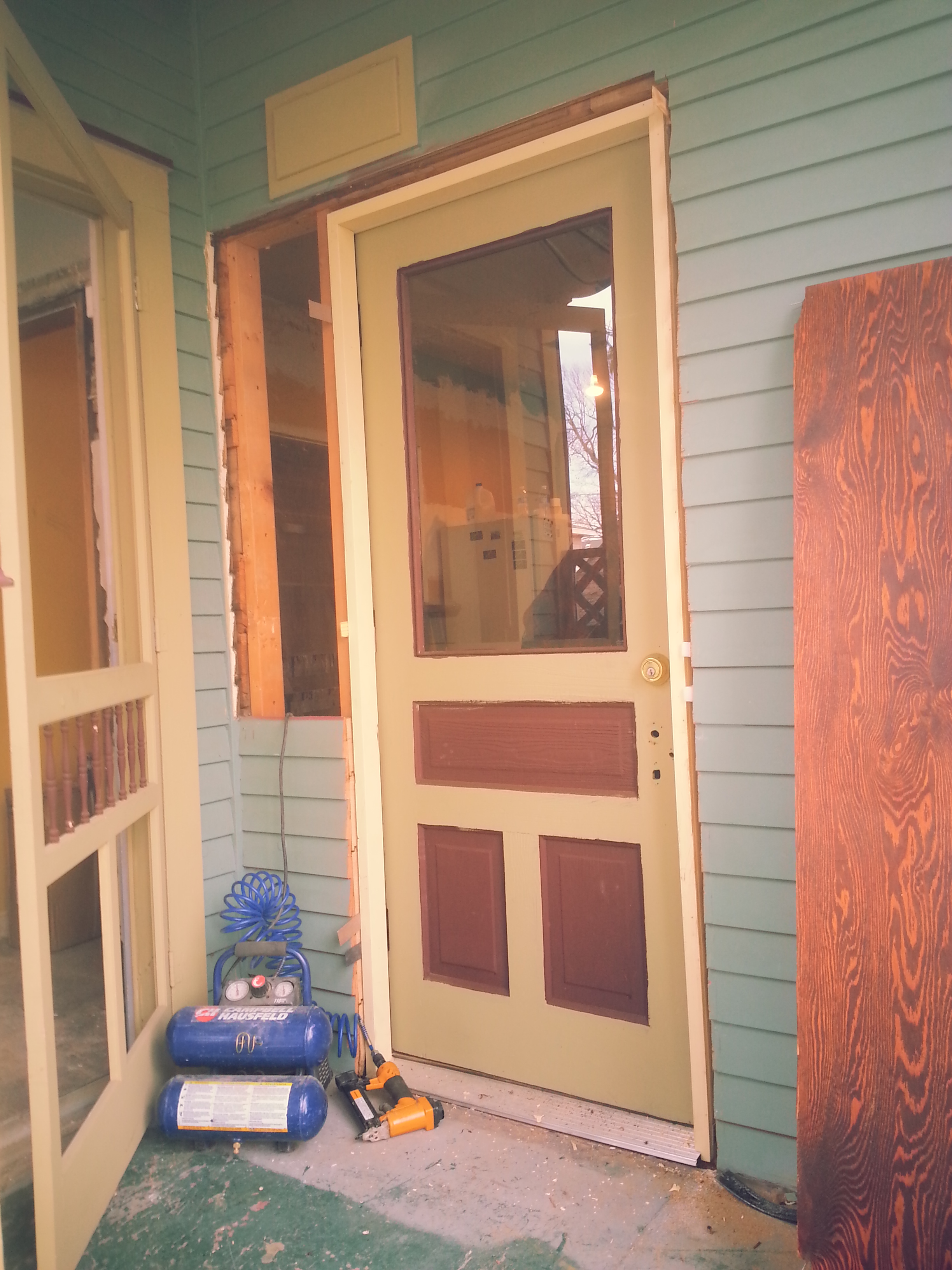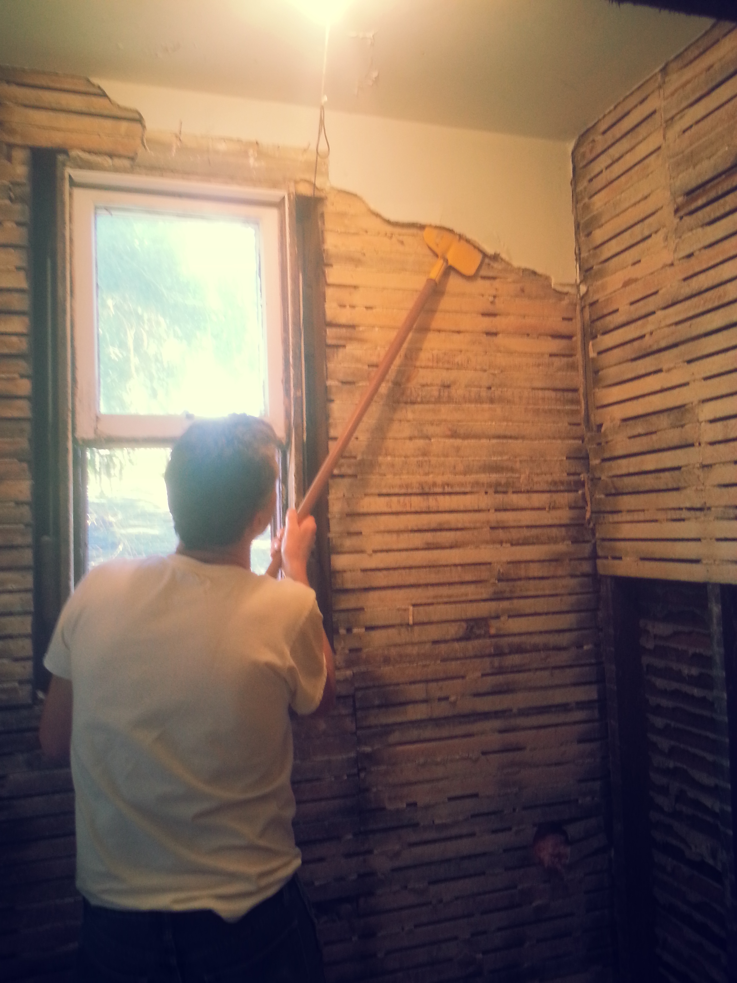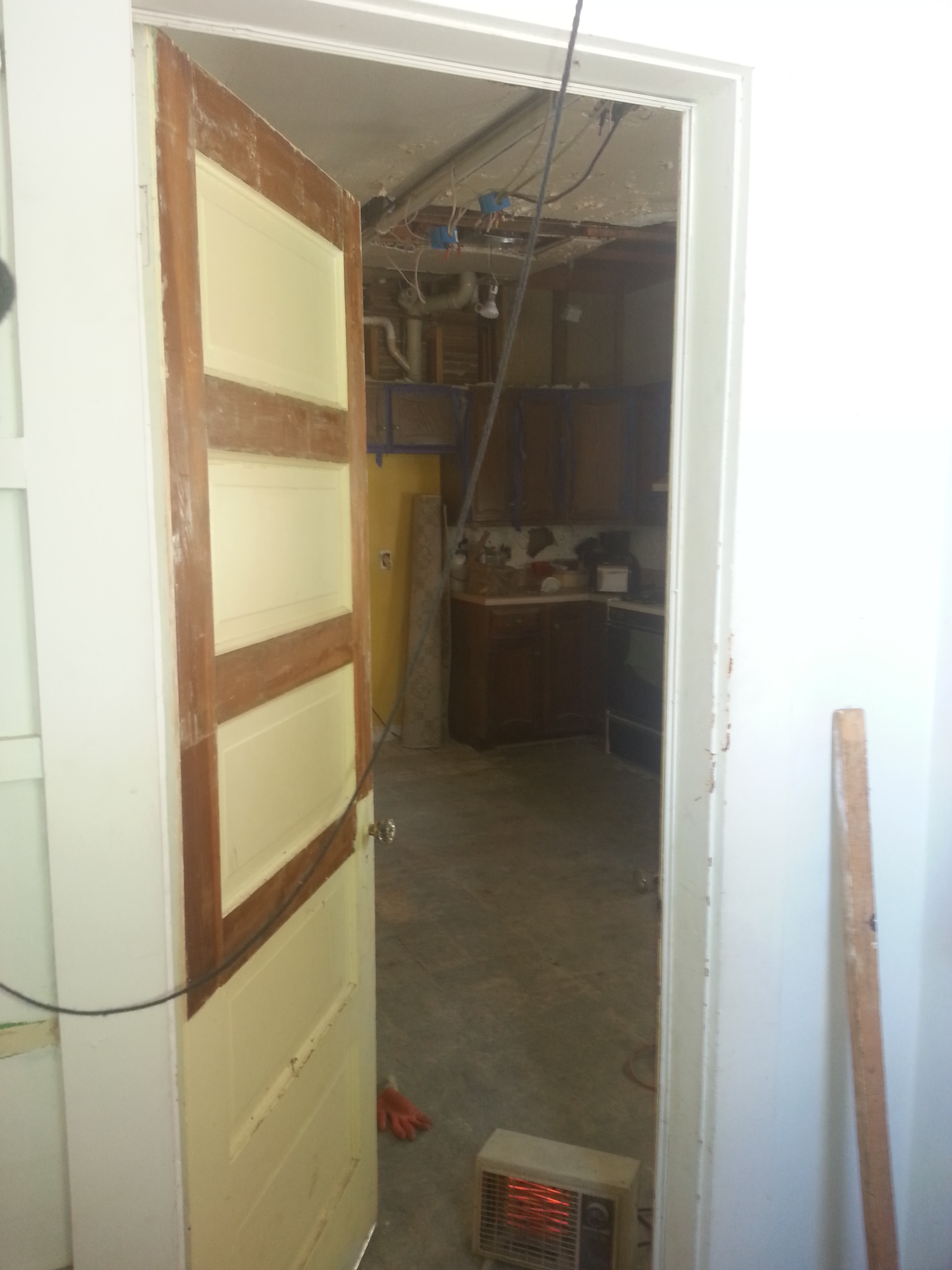 Our floors in the kitchen had obviously been redone at some point in the recent past. A light colored wood laminate was what was in the kitchen when we moved in. Since we had already refinished all of the hardwood in the rest of the home to a dark cherry color we decided that we really wanted to put some kind of stone in for our new floor in the kitchen. That meant a lot of demo, ripping up all this laminate floor (don’t worry, I saved as much as I could and will reuse it in our garage later on if I can!), as well as some parts of the plywood floor beneath it. We discovered this beneath the plywood: