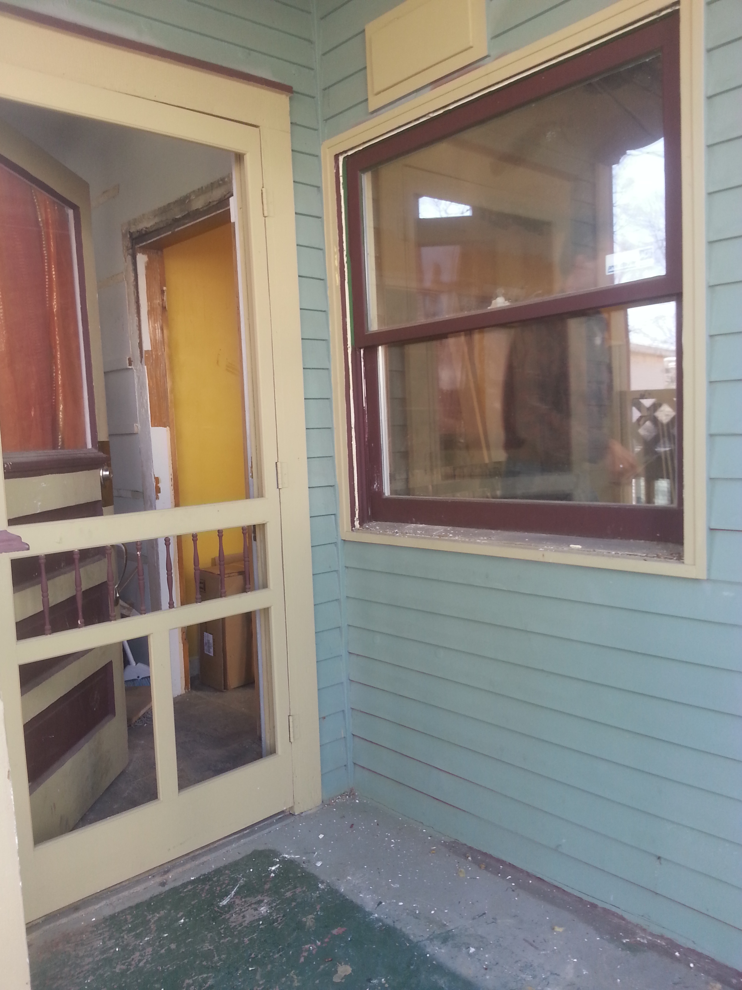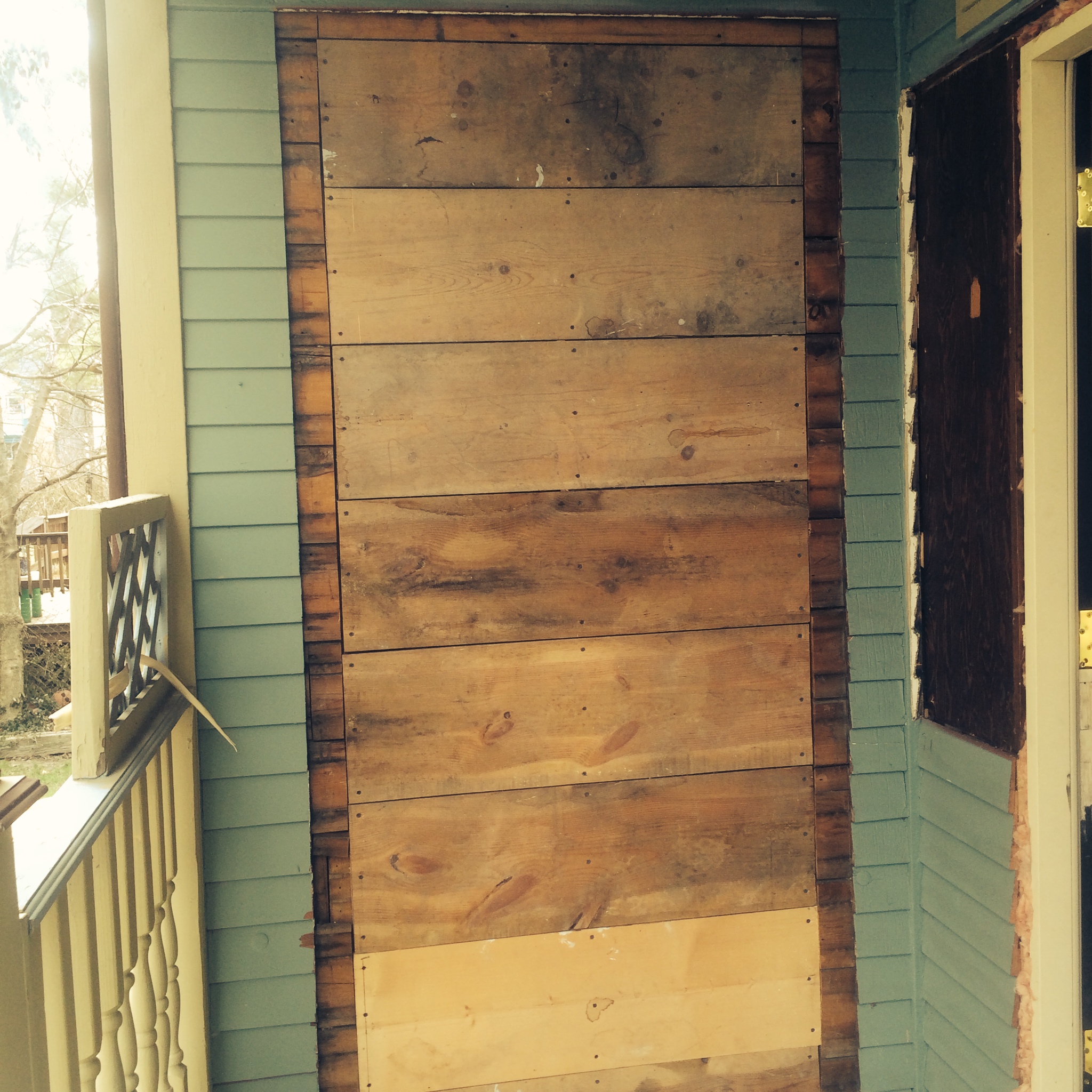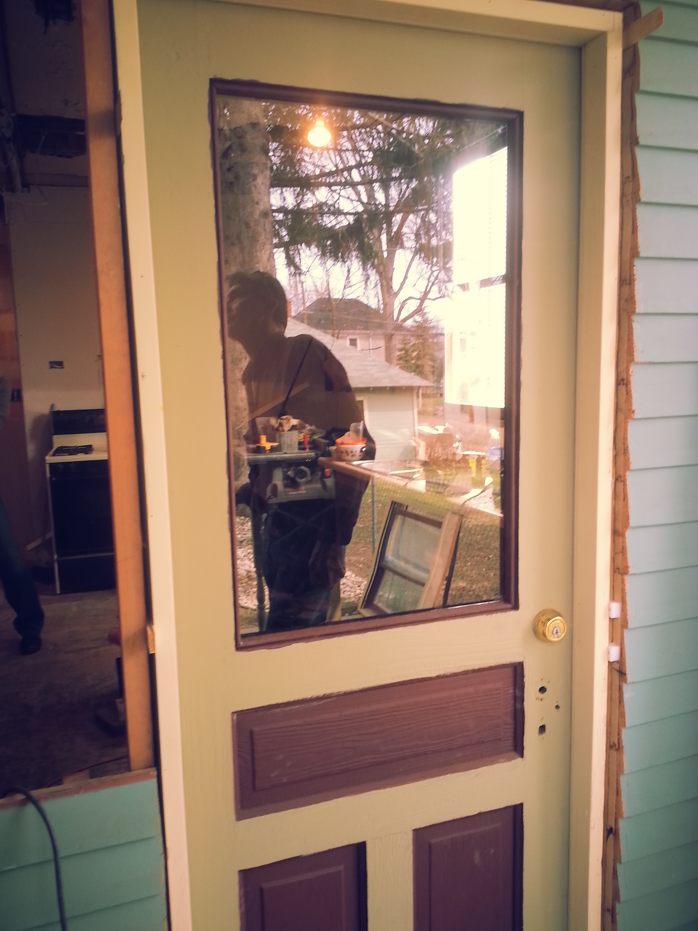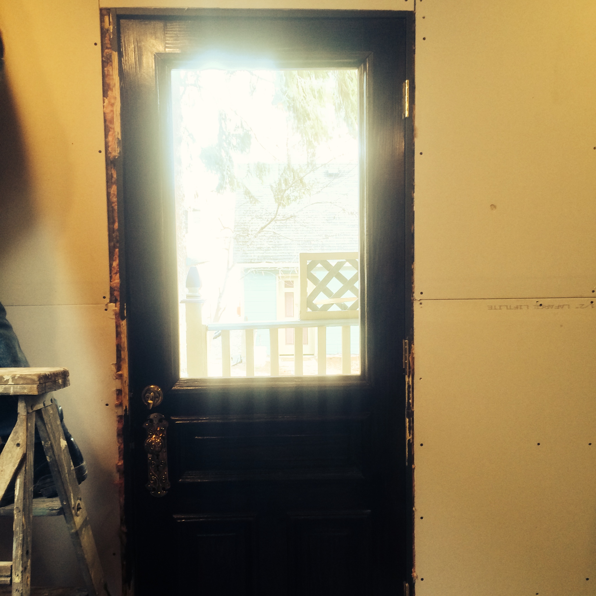 Our floors in the kitchen had obviously been redone at some point in the recent past. A light colored wood laminate was what was in the kitchen when we moved in. Since we had already refinished all of the hardwood in the rest of the home to a dark cherry color we decided that we really wanted to put some kind of stone in for our new floor in the kitchen. That meant a lot of demo, ripping up all this laminate floor (don’t worry, I saved as much as I could and will reuse it in our garage later on if I can!), as well as some parts of the plywood floor beneath it. We discovered this beneath the plywood: